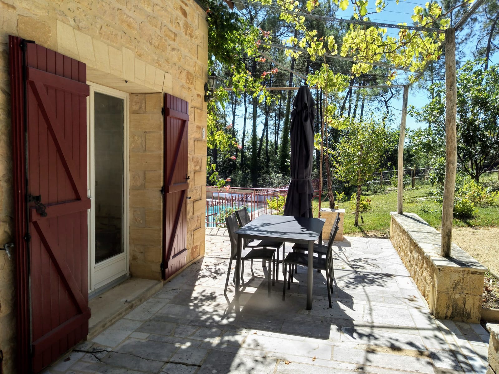 - Une terrasse toute équipée avec vue sur le jardin et la piscine